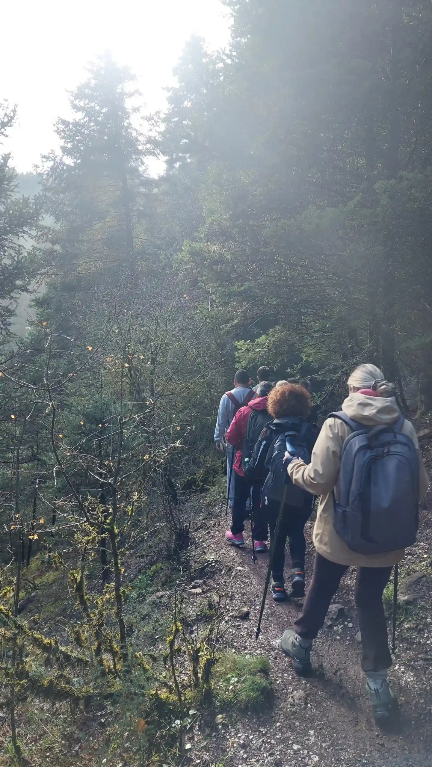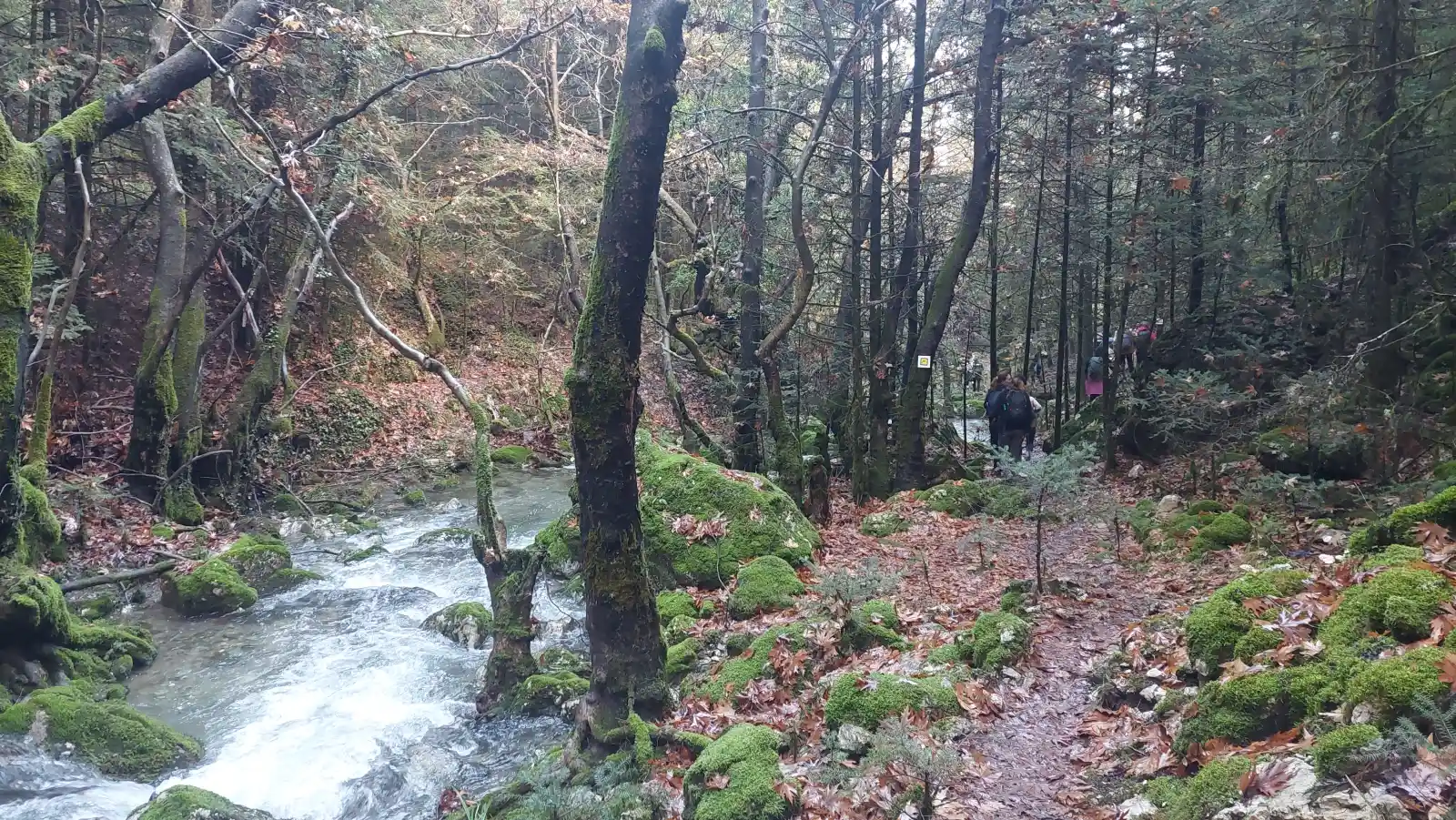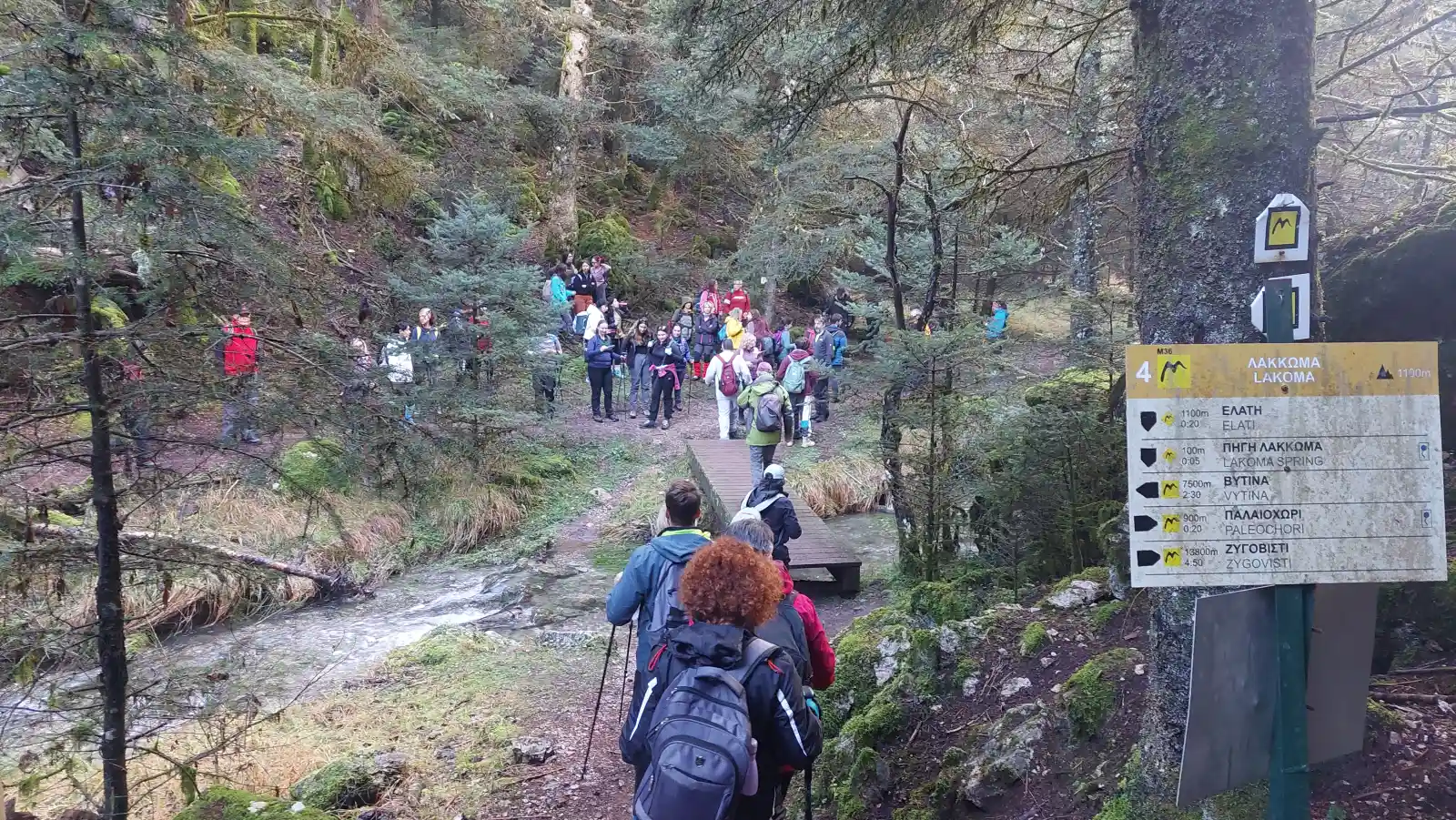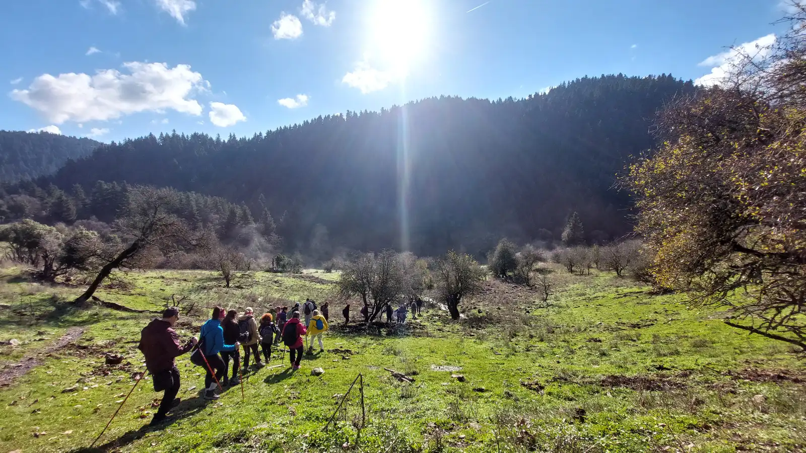 Το μονοπάτι είχε αρκετή λάσπη λόγω των πρόσφατων βροχών, κάνοντάς το παιχνίδι για την ομάδα — λίγο πιο απαιτητικό σε σημεία, αλλά και πολύ πιο ζωντανό. Η εναλλαγή νερών, ξέφωτων και δασικών περασμάτων μάς συνόδευε σε κάθε βήμα, ενώ το Μαίναλο απλωνόταν γύρω μας με όλες τις αποχρώσεις του χειμώνα. Στα σημεία θέας, το βλέμμα έφευγε μακριά προς τις βουνοκορφές και τους οικισμούς που “κρύβονται” ανάμεσα στο δάσος, προσφέροντας εκείνη τη μοναδική αίσθηση ότι βρίσκεσαι μέσα σε μια κινούμενη ζωγραφιά.