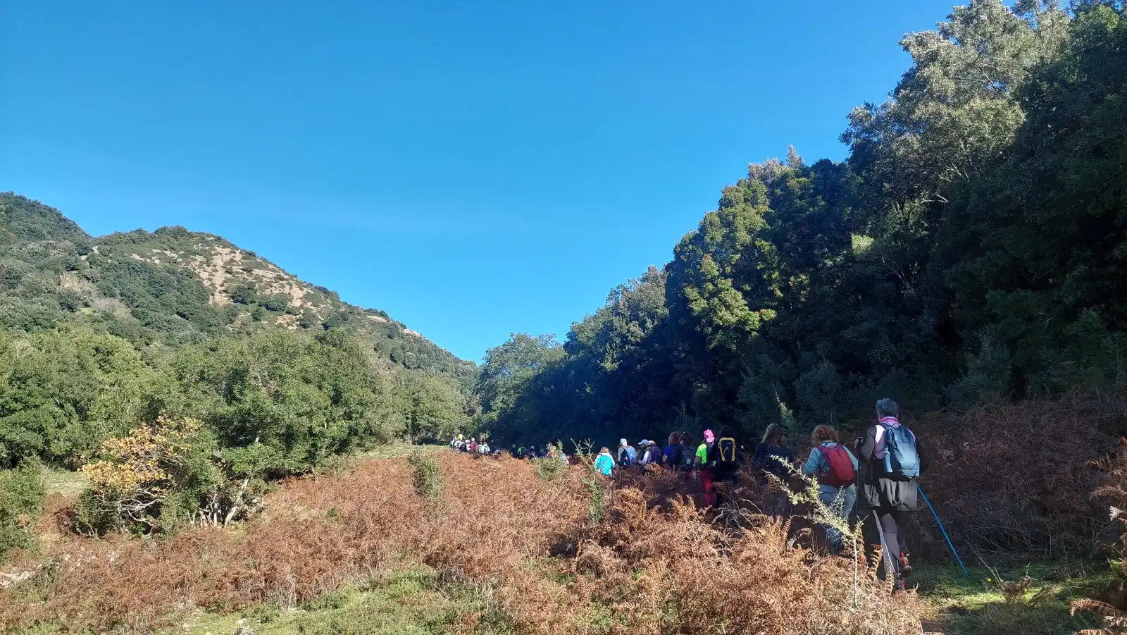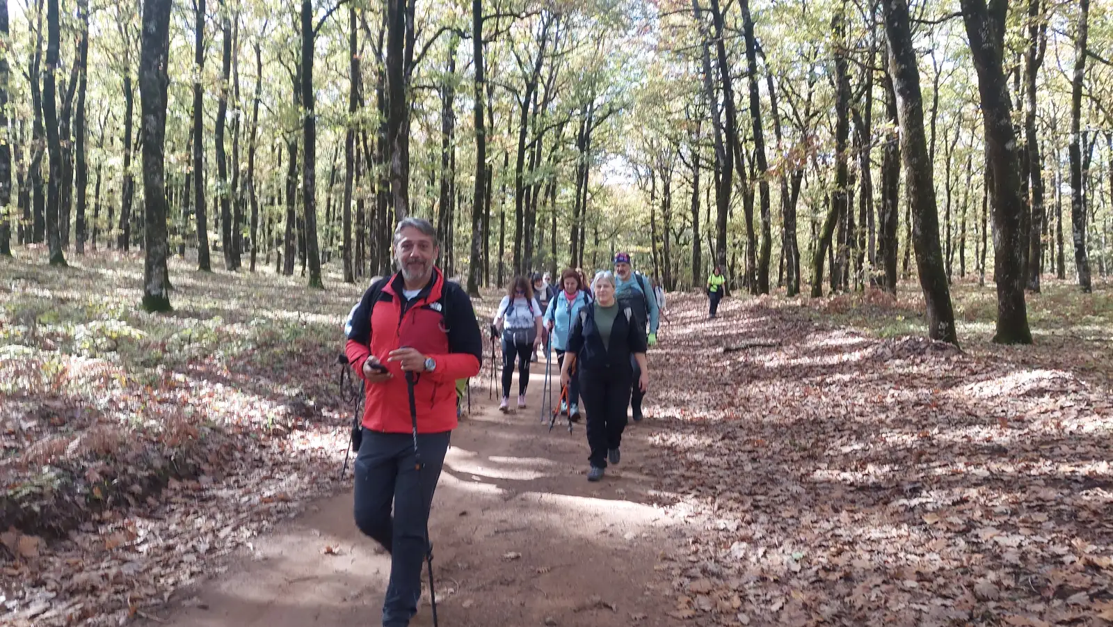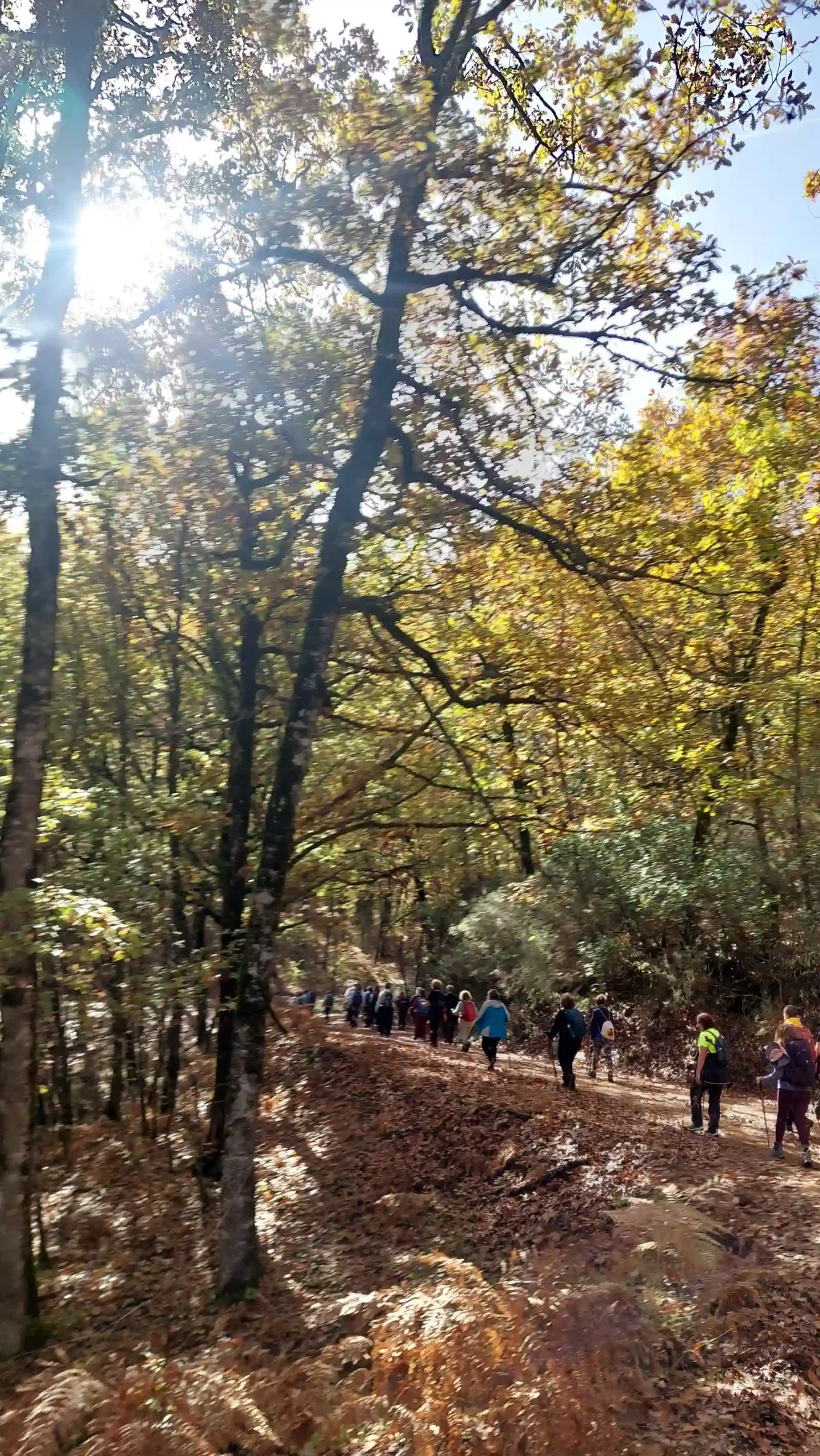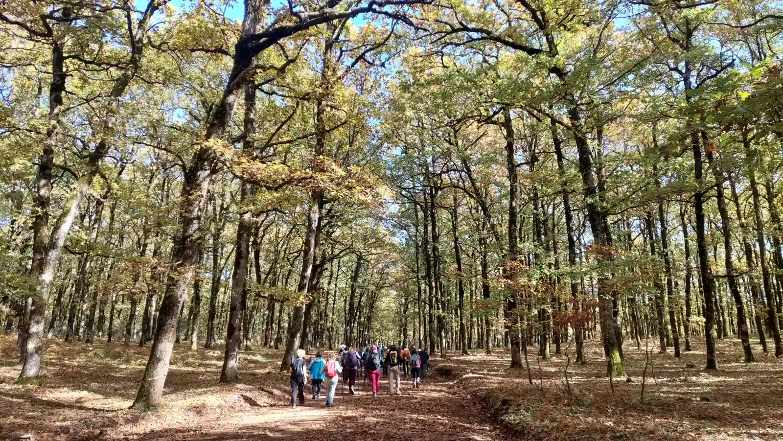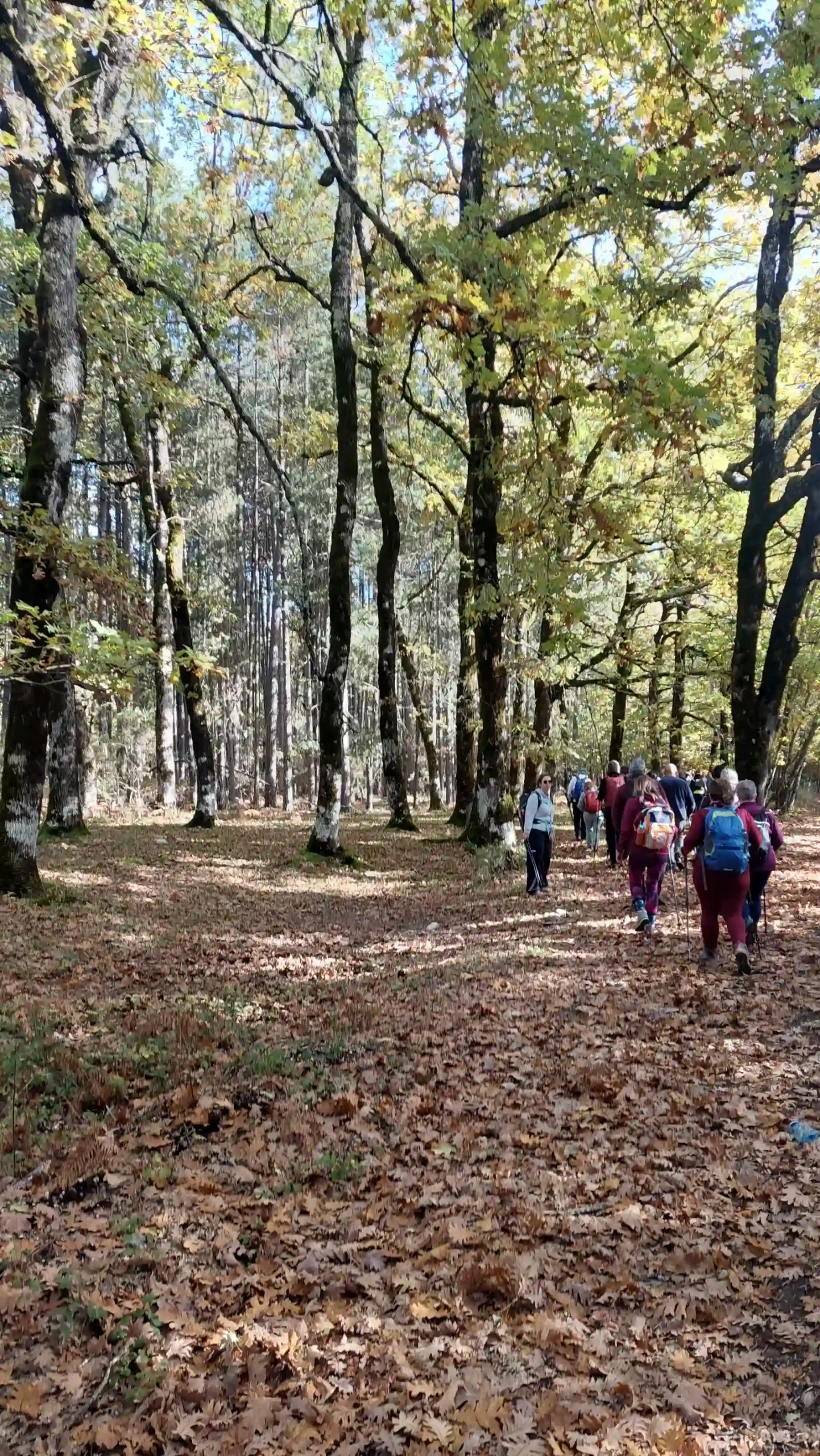 Η ομάδα προχωρά μέσα στο φωτεινό φθινοπωρινό τοπίο της Φολόης.