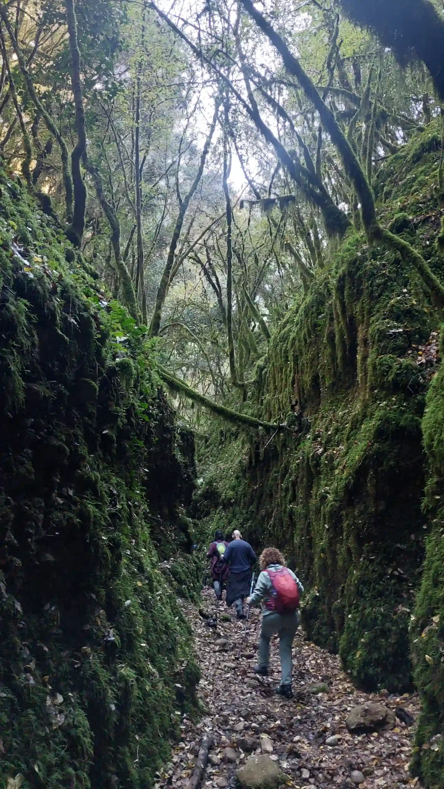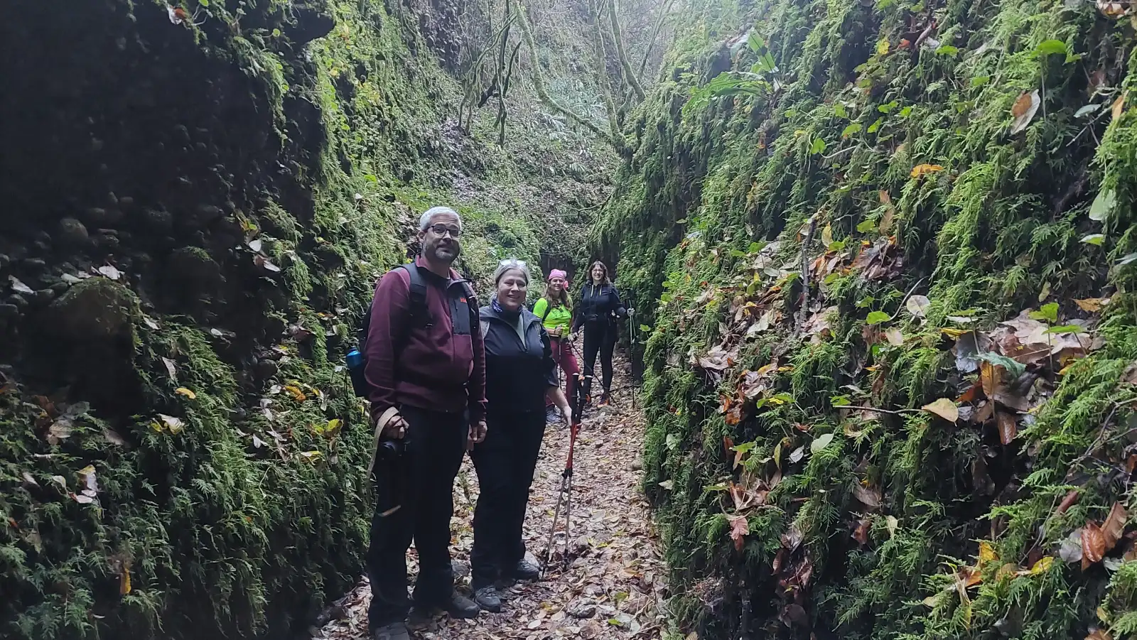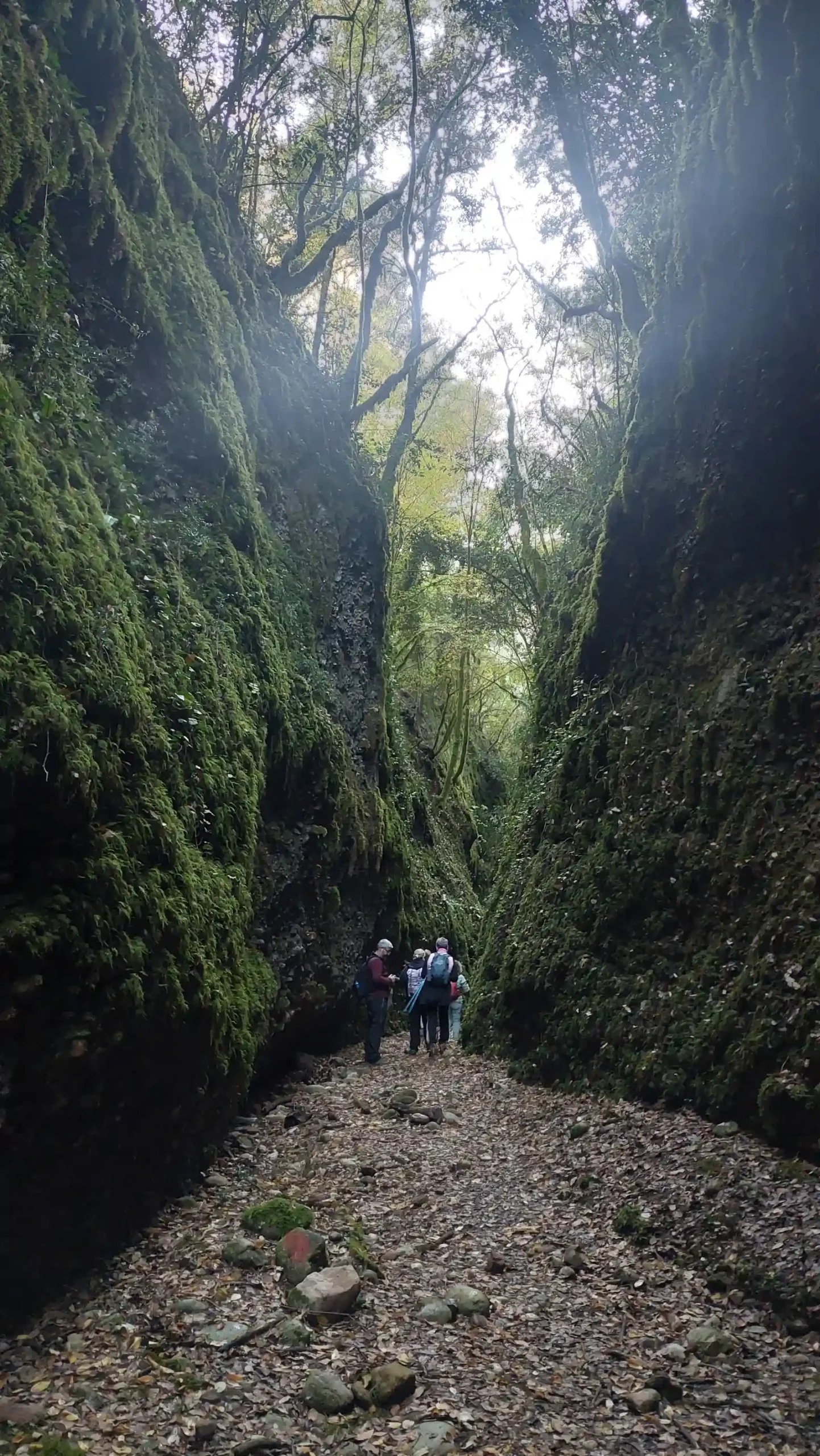 Φίλοι της ομάδας σε στενό σημείο του φαραγγιού, με βράχια καλυμμένα από πράσινα βρύα.
