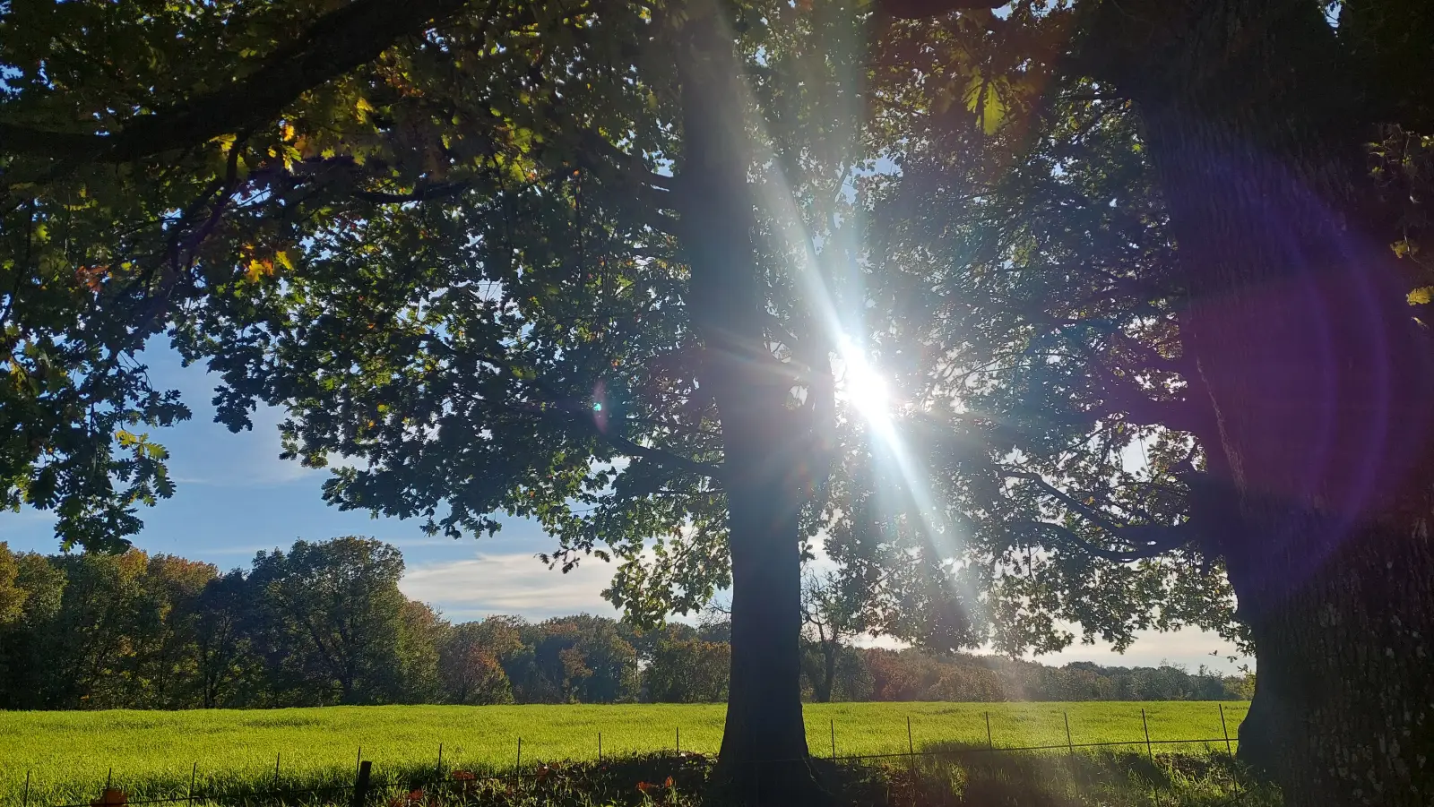 Καταπράσινο λιβάδι κάτω από λαμπερό πρωινό φως, λίγο πριν μπούμε στο δρυοδάσος.