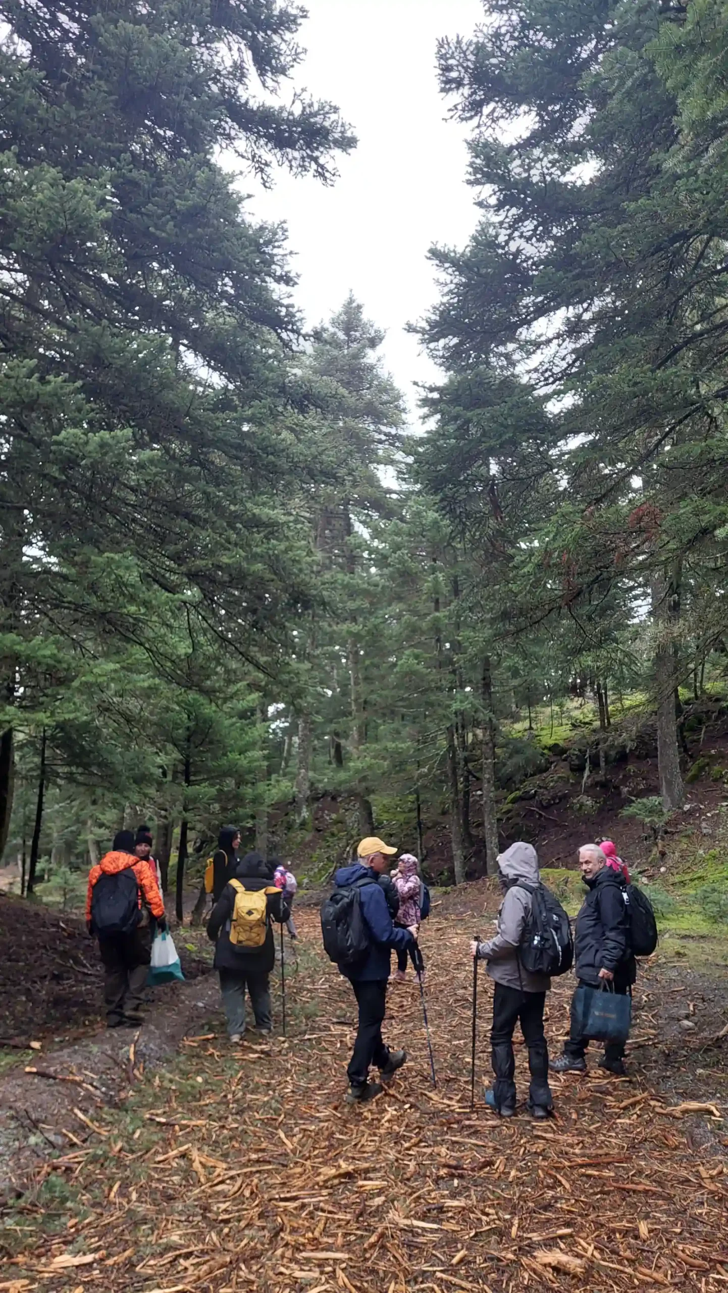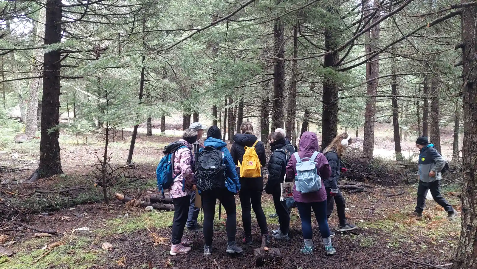 Η ομάδα κατά τη διαδρομή μέσα στο ελατοδάσος, έτοιμη για νέες ανακαλύψεις.