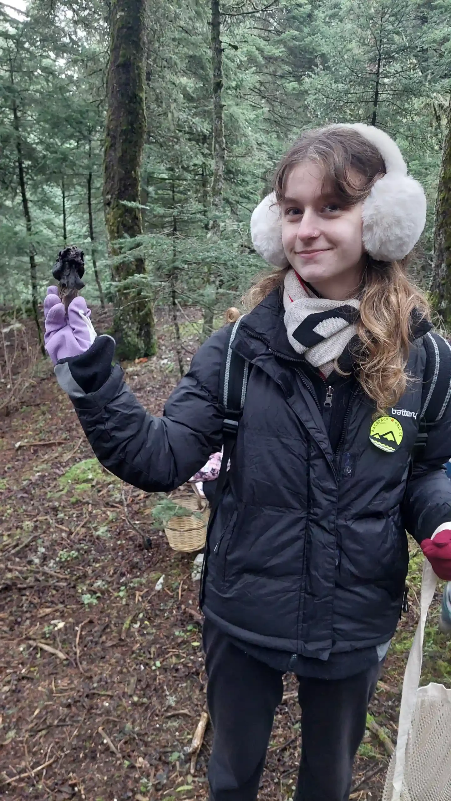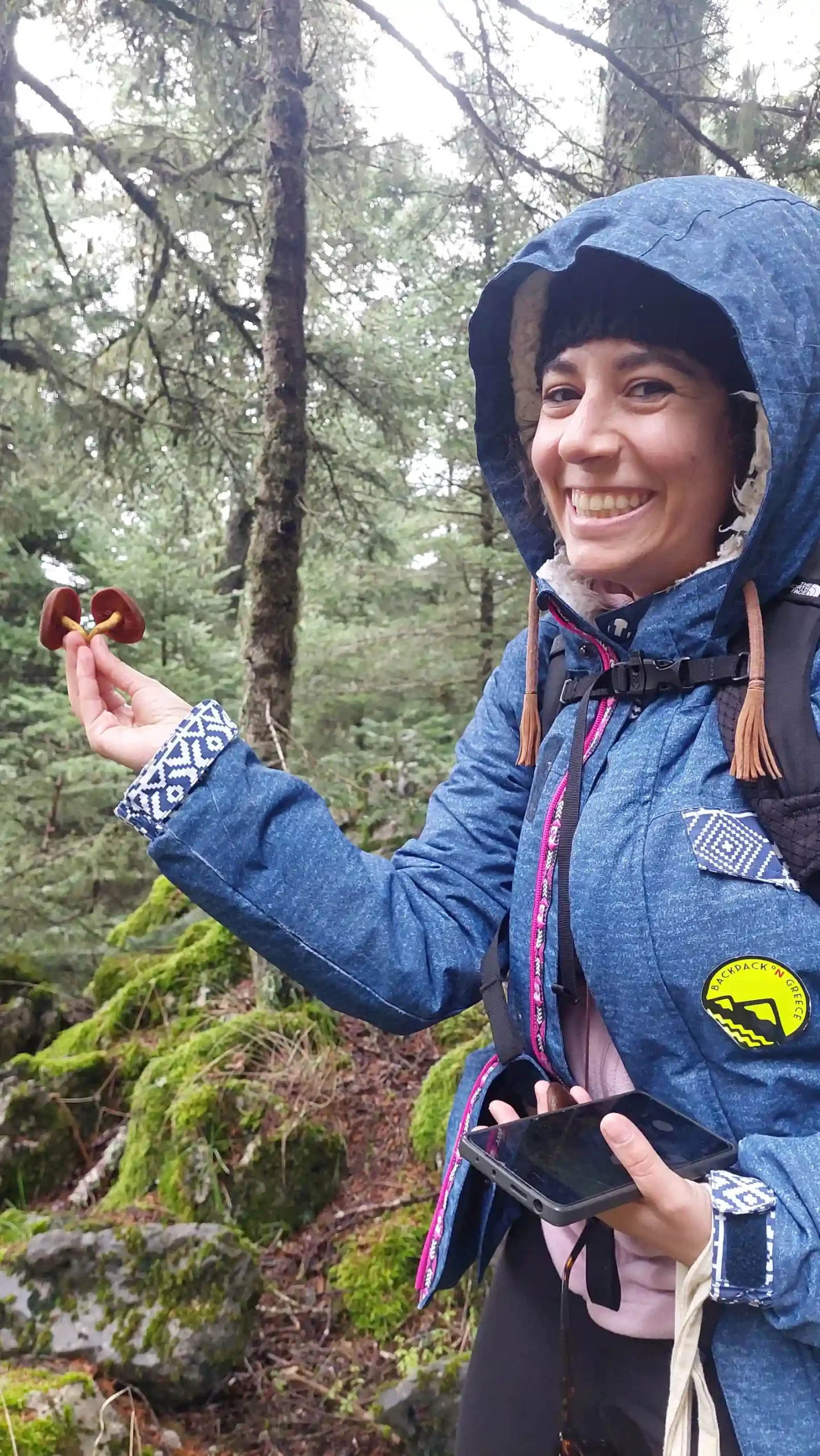 Συμμετέχουσα χαμογελά κρατώντας το μανιτάρι που μόλις εντόπισε στο δάσος