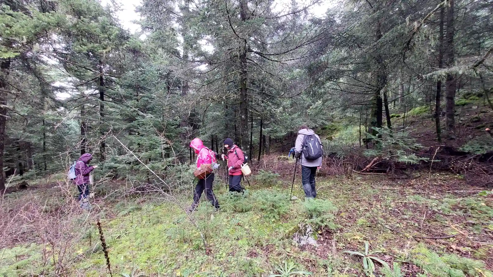 Η ομάδα εξερευνά το έδαφος του ελατοδάσους στο Μαίναλο αναζητώντας διάφορους τύπους μυκήτων.