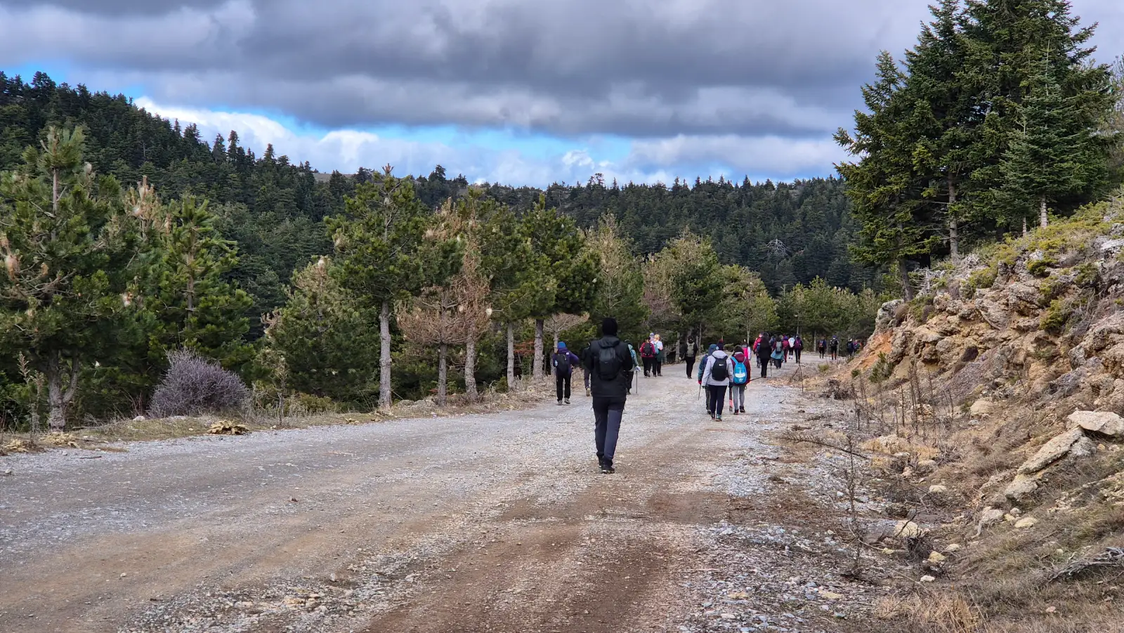 Η παρέα απλώνεται στο μονοπάτι, μέσα στη γαλήνη του βουνού.